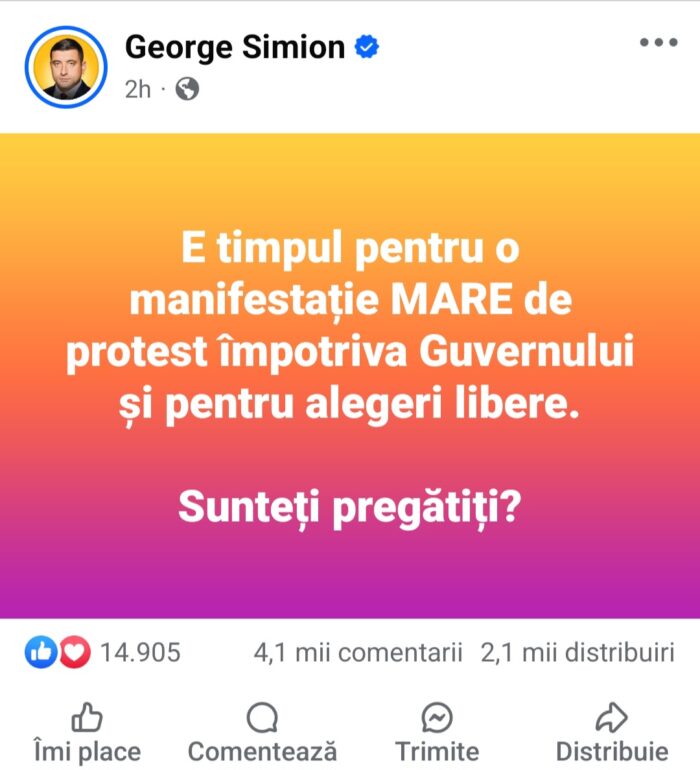 „E timpul pentru o manifestație MARE de protest împotriva Guvernului și pentru alegeri libere. Sunteți pregătiți?”, a scris George Simion pe Facebook, potrivit Știripesurse.